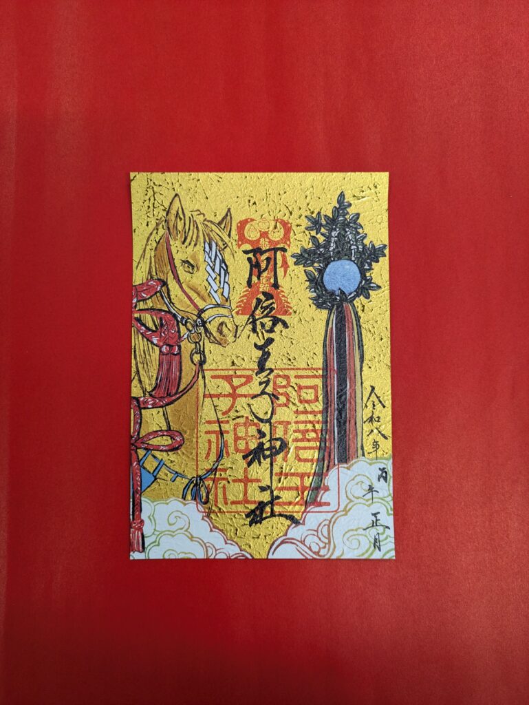 阿倍王子神社の「神馬(しんめ)」御朱印は背景が金色で陽、また馬が口を閉じる=阿吽の「吽」で陰を表現し、陰陽が整ったおめでたい御朱印としました。